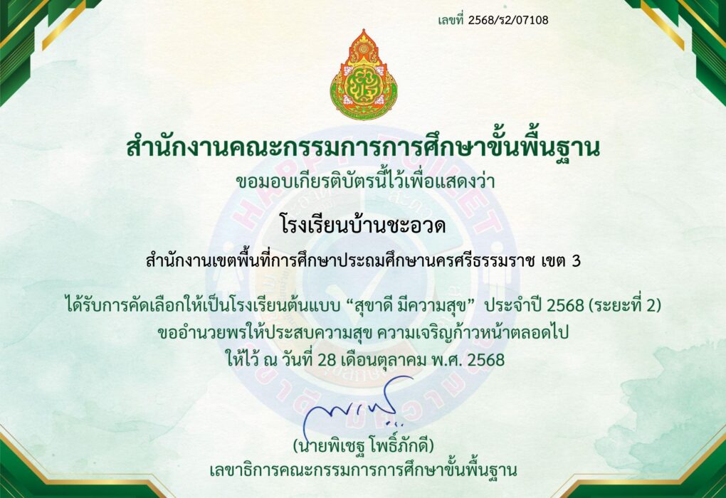 วันที่ 15 พฤศจิกายน 2568 โรงเรียนบ้านชะอวด ขอแสดงความยิ… - โรงเรียนบ้านชะอวด ได้รับคัดเลือกให้เป็นโรงเรียนต้นแบบ “สุขาดี มีความสุข” ประจำปี 2568 (ระยะที่ 2)