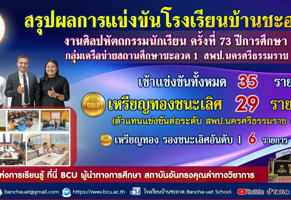 โรงเรียนบ้านชะอวด ขอแสดงความยินดีและชื่นชม นักฟุตบอลทีม… - สรุปผลการแข่งขันโรงเรียนบ้านชะอวด งานศิลปหัตถกรรมนักเรียน ครั้งที่ 73 ปีการศึกษา 2568 กลุ่มเครือข่ายสถานศึกษาชะอวด 1 สพป.นครศรีธรรมราช เขต 3