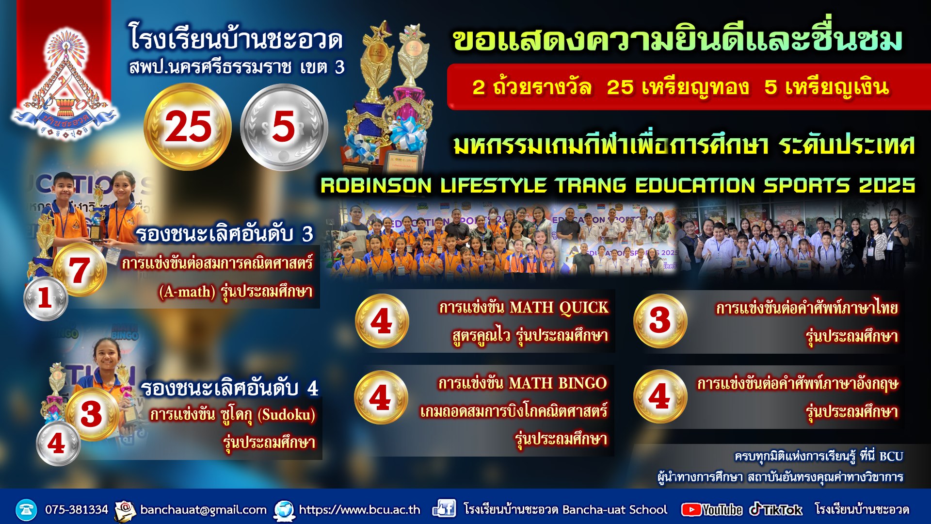 วันที่ 29 มกราคม 2567 ในกิจกรรมหน้าเสาธง ผู้บริหาร และคณะครูโรงเรียนชะอวดวิทยาคาร นำโดยนายอรรถพร อักษรนำ ผู้อำนวยการโรงเรียนชะอวดวิทยาคาร มอบโล่รางวัลชนะเลิศ ประเภทคะแนนรวม แก่เด็กหญิงณัฐมน ลิมปวัฒนานนท์ นักเรียนชั้น ป.6/1 ในการสอบวัดความรู้เยาวชนคนเก่ง ครั้งที่ 12 ปีการศึกษา 2566 โรงเรียนชะอวดวิทยาคาร โดยมีว่าที่ร้อยตรี ดร.พินิจ สังสัพพันธ์ ผู้อำนวยการโรงเรียนบ้านชะอวด พร้อมด้วยรองผู้อำนวยการโรงเรียนบ้านชะอวด และคณะครูร่วมแสดงความยินดี และให้การต้อนรับคณะจากโรงเรียนชะอวดวิทยาคาร