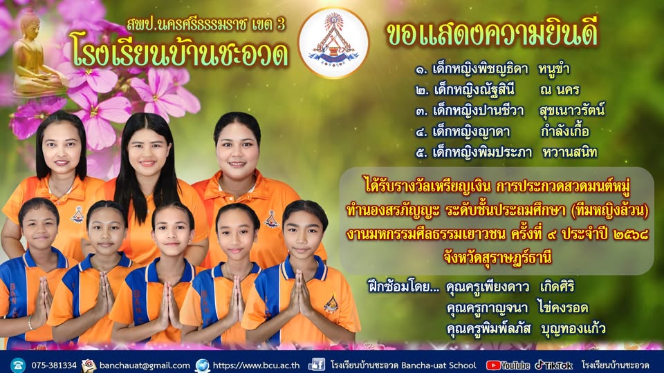 นักเรียนโรงเรียนบ้านชะอวดจำนวน 22 คนตัวแทนสมาคมกรีฑาอำเภอชะอวดเข้าร่วมการแข่งขันกีฬา กรีฑา นักเรียน นักศึกษา และประชาชน จังหวัดนครศรีธรรมราช”นครเกมส์” สรุปเหรียญ 8 ทอง 13 เงิน 1 ทองแดง