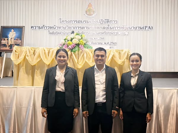 วันที่ 12 กันยายน 2568 ดร.เข็บ บุญวรรณ ผู้อำนวยการโรงเรียนบ้านชะอวด พร้อมด้วยนางสาวอมรรัตน์ จันศิริ แะนางสาวภัณฑิรา นาคะสรรค์ รองผู้อำนวยการโรงเรียนบ้านชะอวด เข้าร่วมการอบรมเชิงปฏิบัติการความก้าวหน้าทางวิชาการตามข้อตกลงในการพัฒนางาน (PA) ในสังกัดสำนักงานเขตพื้นที่การศึกษานครศรีธรรมราช เขต 3 ประจำปีงบประมาณ พ.ศ.2568 ณ โรงแรมหาดแก้วรีสอร์ท อ.สิงหนคร จ.สงขลา