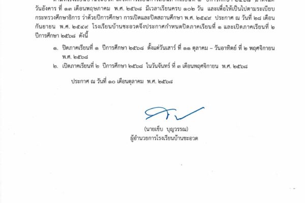 📢ประกาศโรงเรียนบ้านชะอวด เรื่อง ปิดภาคเรียนที่ 1 และเปิ…