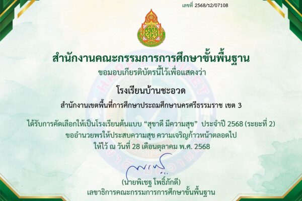 โรงเรียนบ้านชะอวด ได้รับคัดเลือกให้เป็นโรงเรียนต้นแบบ “สุขาดี มีความสุข” ประจำปี 2568 (ระยะที่ 2)