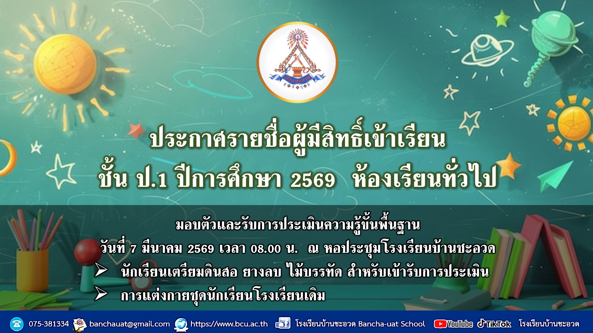 📌ประกาศรายชื่อผู้มีสิทธิ์เข้าเรียนชั้นประถมศึกษาปีที่ 1 ปีการศึกษา 2569 ห้องเรียนทั่วไป